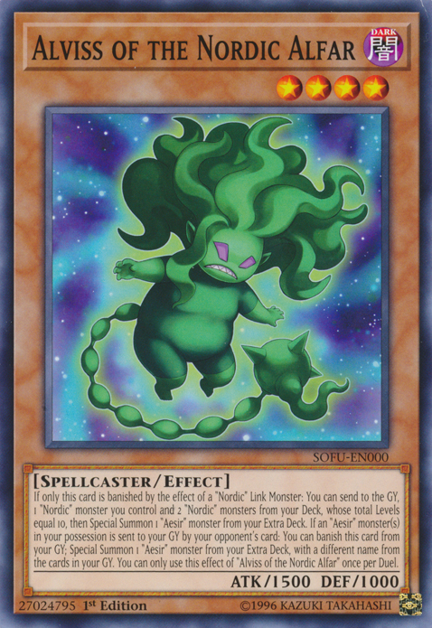 If only this card is banished by the effect of a “Nordic” Link Monster: You can send to the GY 1 “Nordic” monster you control and 2 “Nordic” monsters from your Deck whose total Levels equal 10, then Special Summon 1 “Aesir” monster from your Extra Deck. If an “Aesir” monster(s) in your possession is sent to your GY by your opponent’s card: You can banish this card from your GY; Special Summon 1 “Aesir” monster from your Extra Deck with a different name from the cards in your GY. You can only use this effect of “Alviss of the Nordic Alfar” once per Duel.