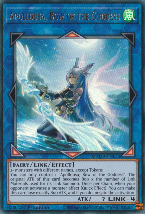 2+ monsters with different names, except Tokens You can only control 1 "Apollousa, Bow of the Goddess". The original ATK of this card becomes 800 x the number of Link Materials used for its Link Summon. Once per Chain, when your opponent activates a monster effect (Quick Effect): You can make this card lose exactly 800 ATK, and if you do, negate the activation.
