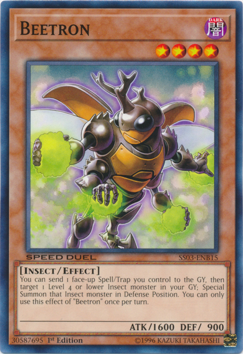 You can send 1 face-up Spell/Trap Card you control to the GY, then target 1 Level 4 or lower Insect monster in your GY; Special Summon that Insect monster in Defense Position. You can only use this effect of "Beetron" once per turn.