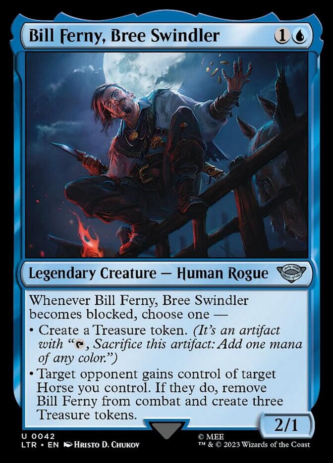 • Target opponent gains control of target Horse you control. If they do, remove Bill Ferny from combat and create three Treasure tokens.